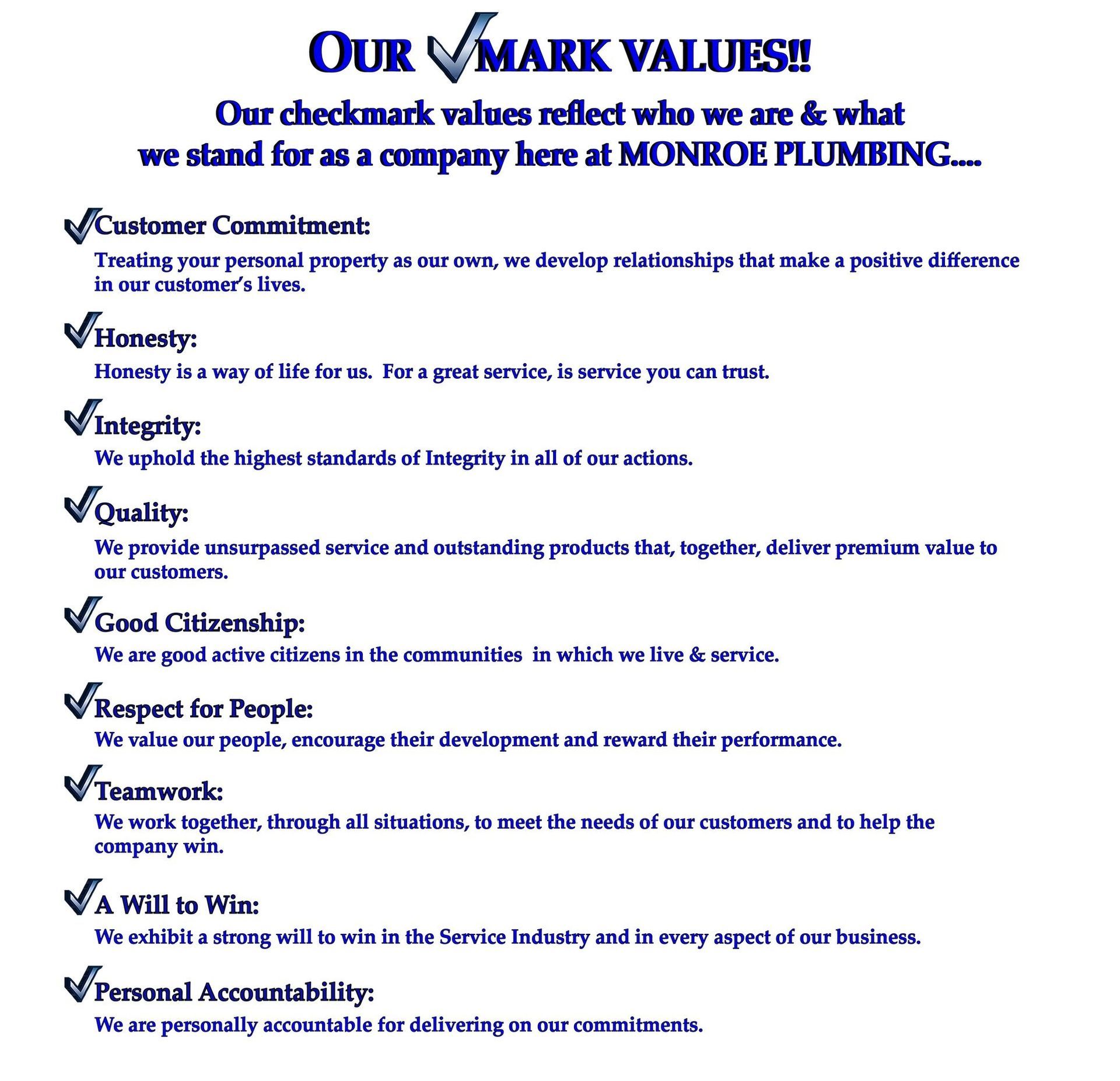 Our mission at Monroe Plumbing is to stand behind our name, checkmark values, & goals to provide unparalleled service. We go above the line, from educating the customer to giving repair options & permanent solutions. Treating your property as our own, we leave every situation better than found & make the customers service needs stress free.